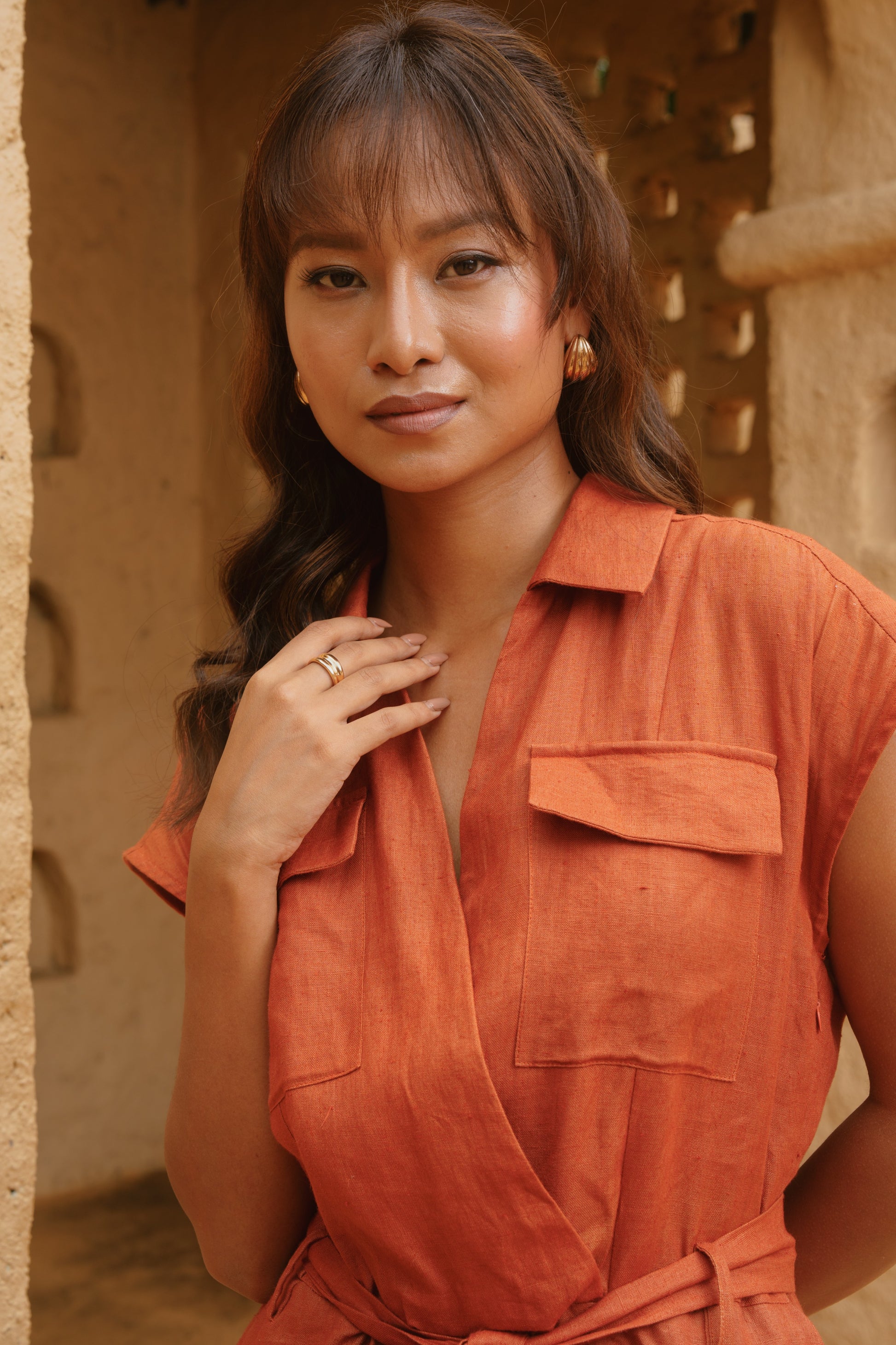 Sleek, structured, and effortlessly cool, this rust toned utility jumpsuit redefines modern-day chic. With its clean lines, cargo-style detailing, and cropped ankle length, this piece is equal parts functional and fashionable. Whether styled with heels for a polished daytime look or dressed down with flats for weekend wear, it’s the perfect go-to for elevated comfort and contemporary look