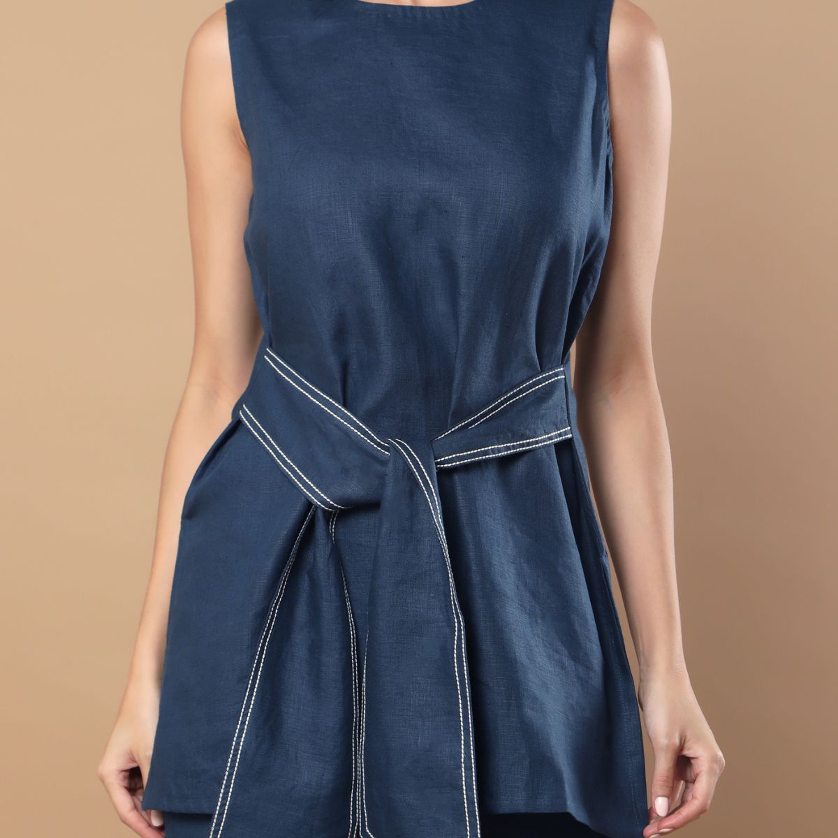 - Sleeveless top with attached belt; highlighted with thread embroidery.